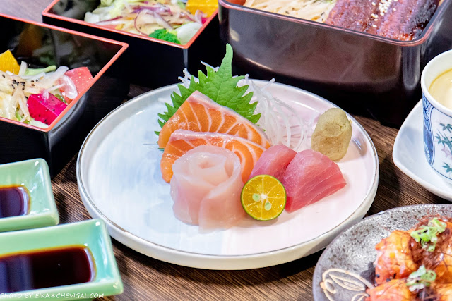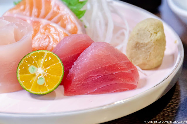 綜合刺身(7片)$260元,來吃日式料理當然少不了生魚片!綜合刺身內有鮭魚、鮪魚與旗魚三款基本魚種,新鮮度都很不錯,重點是切片的厚度也太大方了吧!