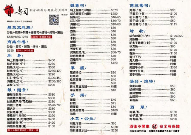 這邊提供首壽司的菜單給你們參考,主要有供應各式丼飯、麵食、壽司、手捲、烤物、湯品、小菜與酒類,另外還有無菜單料理與商業午餐可以選擇!(開車不喝酒,喝酒不開車)