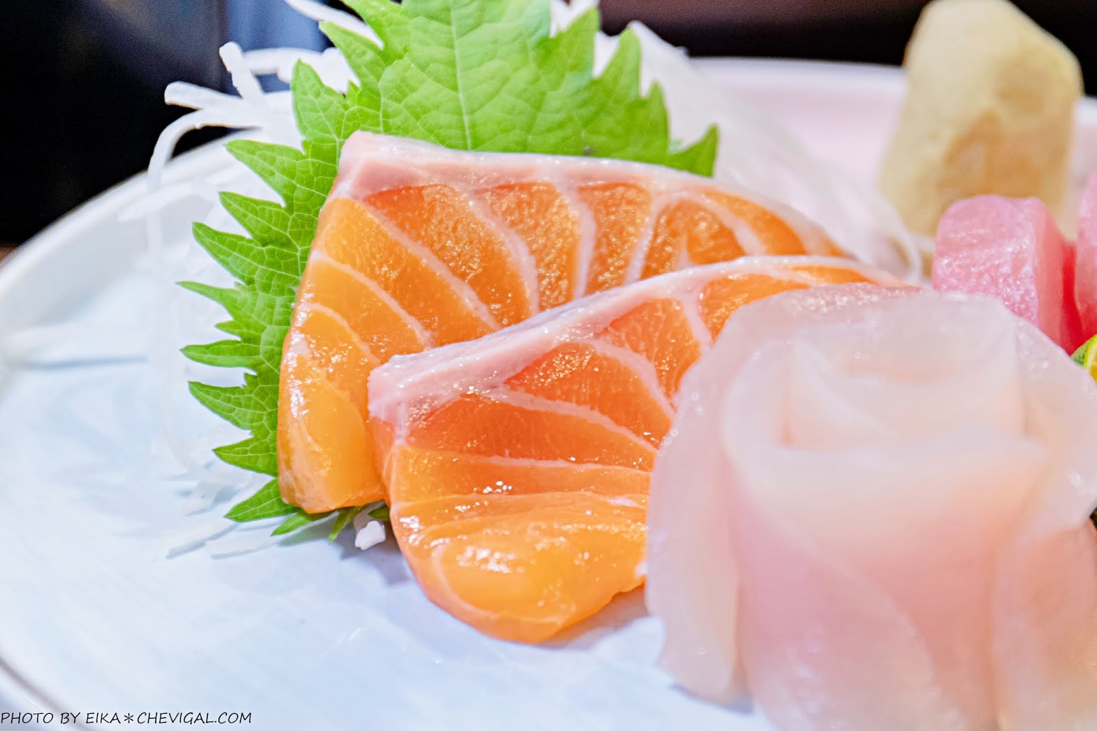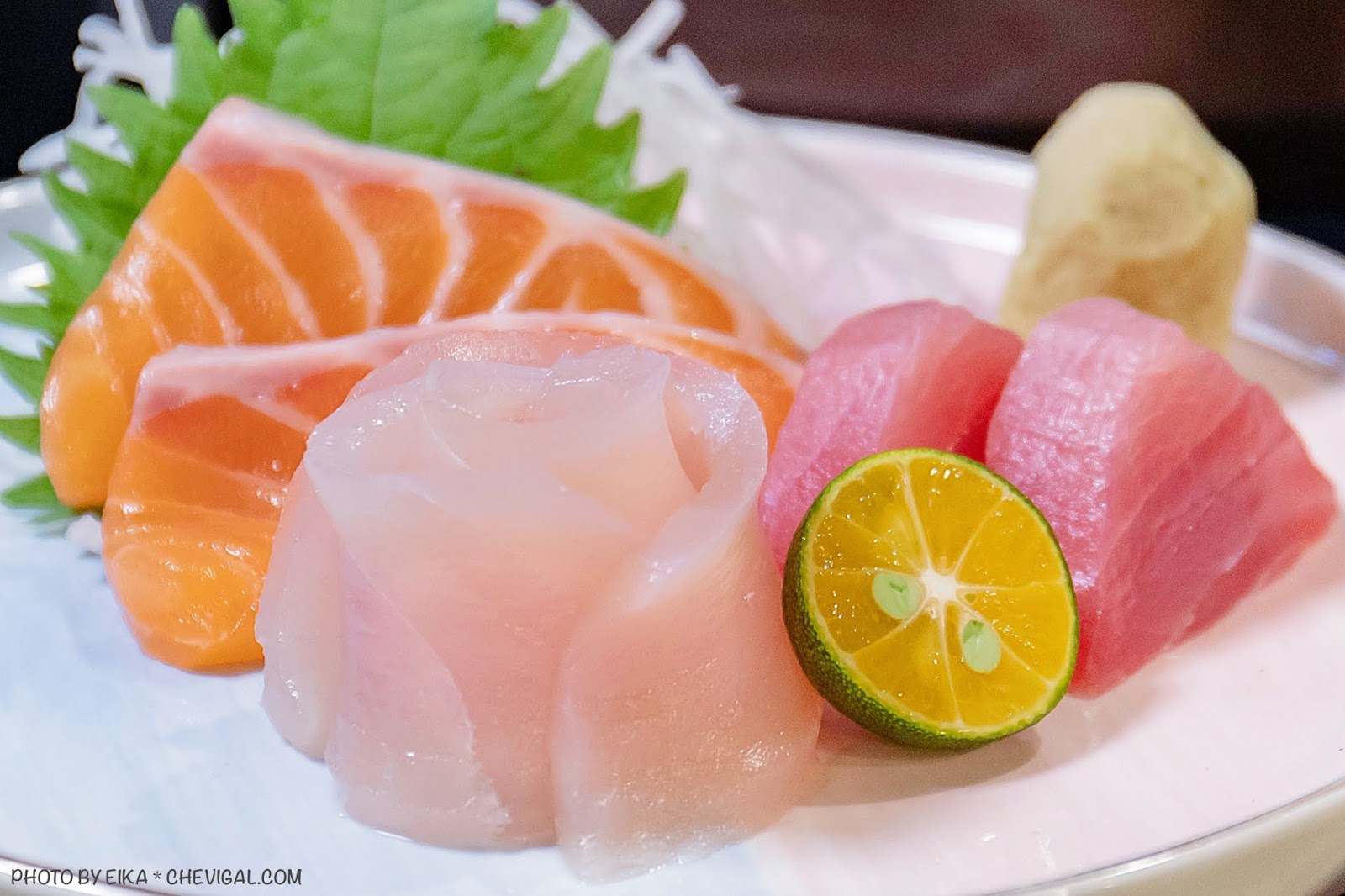 綜合刺身(7片)$260元,來吃日式料理當然少不了生魚片!綜合刺身內有鮭魚、鮪魚與旗魚三款基本魚種,新鮮度都很不錯,重點是切片的厚度也太大方了吧!