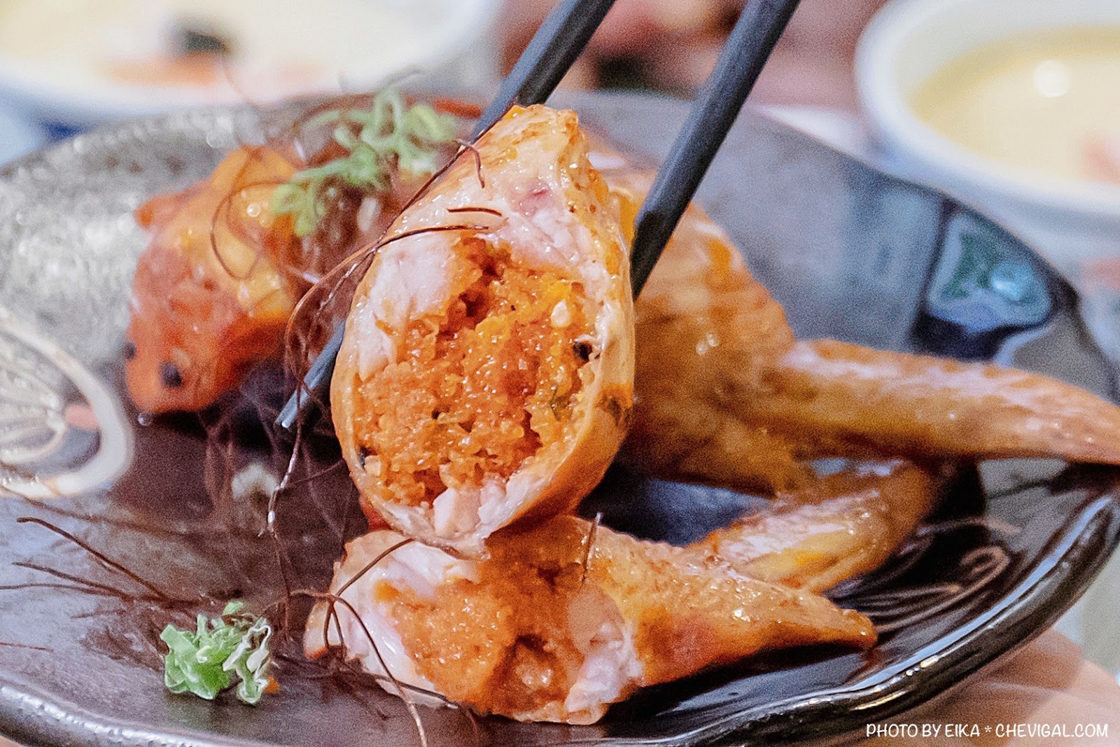 明太子雞(2支)$120元,這道也是許多日式居酒屋必點的經典料理,金黃發亮的雞翅相當飽滿,原來是以新鮮的雞翅去骨後,填入滿滿的明太子魚卵與其他配料,吃起來微辛微辣,下酒應該也很不錯。(開車不喝酒,喝酒不開車)