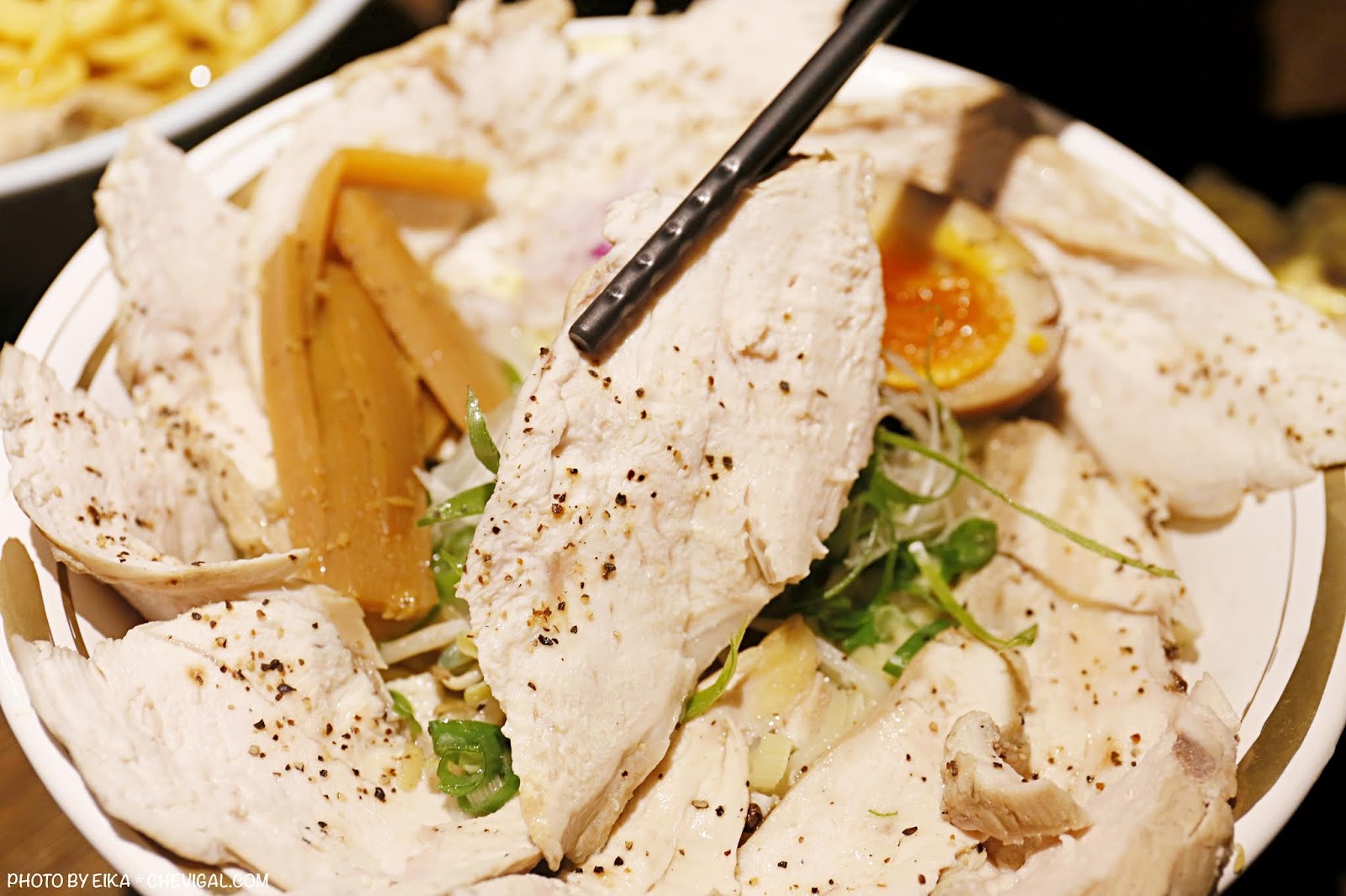 雞零叉燒麵$250元,是雞淡麗系拉麵獨有的招牌品項,湯頭有鹽味與醬油可供選擇,當天我們點的是鹽味湯頭。滿滿整圈的雞肉叉燒肉片讓人完全看不到拉麵!搭配蔥絲、筍乾、豆芽與糖心蛋,豪邁澎湃的份量,幾乎讓兩個女生分食都沒問題!