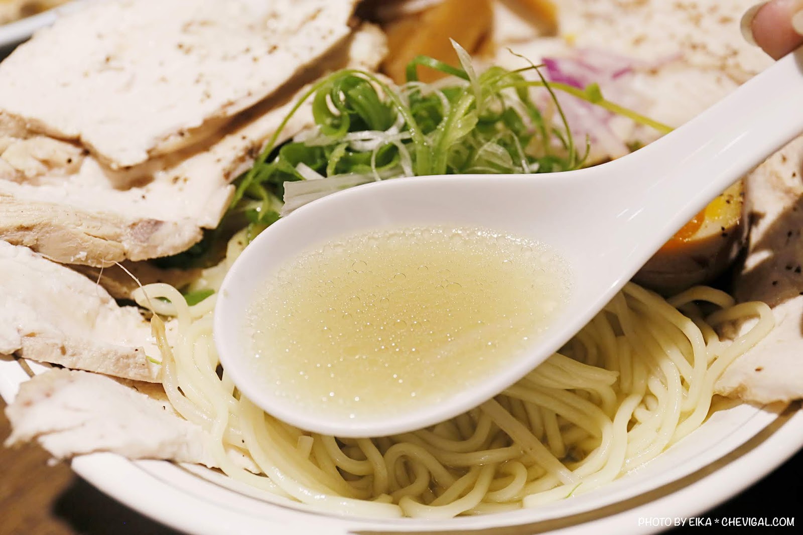 鹽味的湯頭喝來清爽,經過整整一天的熬煮後,雞骨的甜味與精華完全釋放在湯頭裡,相較於豚骨湯頭的醇厚,雞淡麗系的湯頭是比較溫潤的,淡雅溫潤的風味十分討喜。