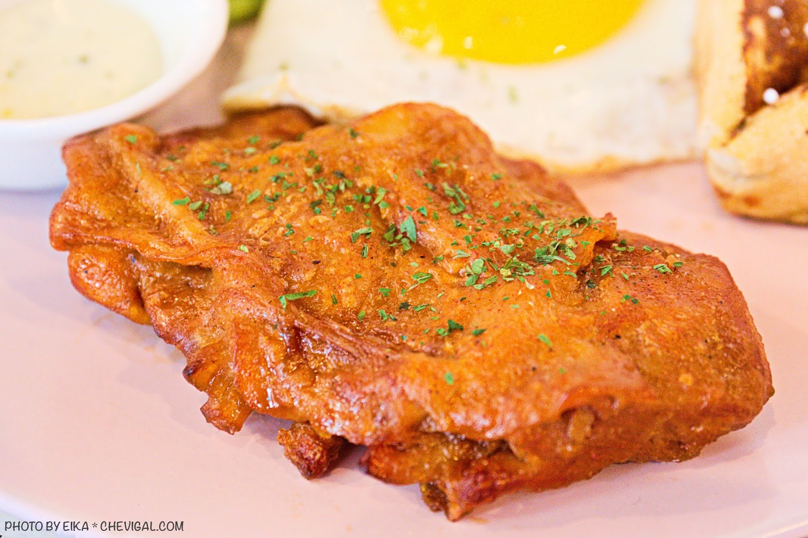 這款法日燻香雞腿排,包含了食蔬、洋芋沙拉、太陽蛋、雞腿排與法式厚片,美麗繽紛的擺盤讓人食指大動,早午餐也能吃得清爽又均衡!