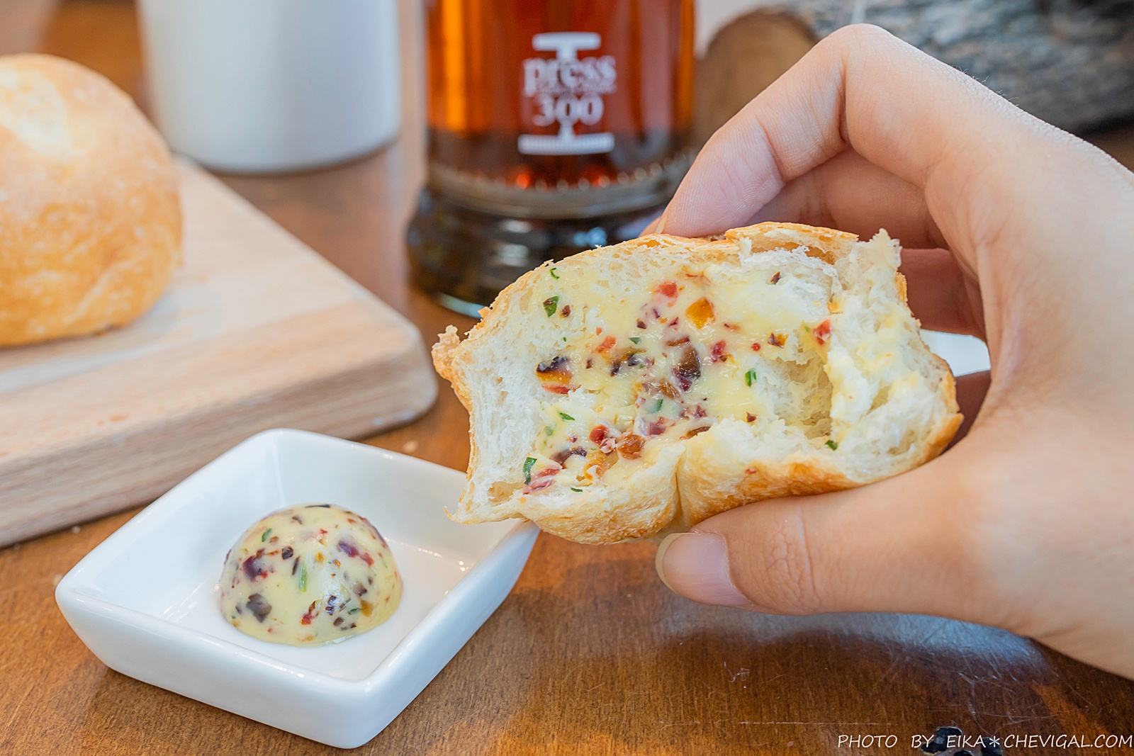 手工烘焙歐式麵包搭風味奶油,外表相當酥脆,內裡吃起來還蠻有嚼勁的,在撕開的時候會發現頗有韌性。