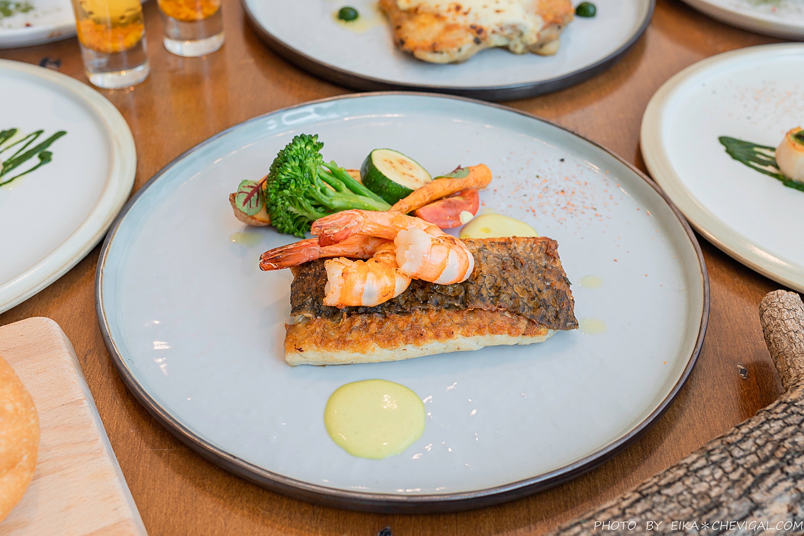另一道主菜是板煎市場鮮魚搭白蝦佐咖哩蛤蜊奶油醬汁,選用的是金目鱸魚與海水白蝦,搭配咖哩蛤蜊奶油醬汁來提鮮,吃起來有點像不會辣的黃芥末醬,風味更加醇厚,相當特別。