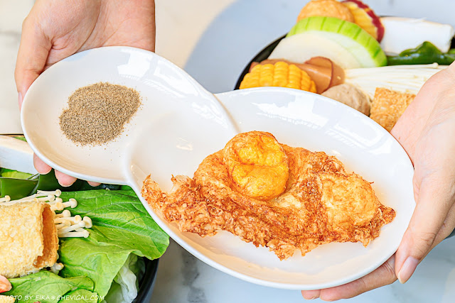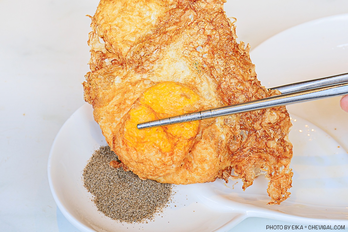 招牌麻油炸蛋$30元,麻油炸蛋是以荷包蛋加入麻油提香,炸至金黃色的色澤~記得可以放入火鍋湯頭之中,讓蛋的正反面吸附飽滿的湯汁,夾起來之後,再沾取由多種中藥特製的調味粉享用。