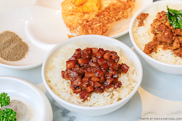 滷肉飯+$16元,另外一款我們換購的是滷肉飯,表面的滷肉份量給得還不少,擁有焦糖般的美麗色澤,看起來也挺誘人的。