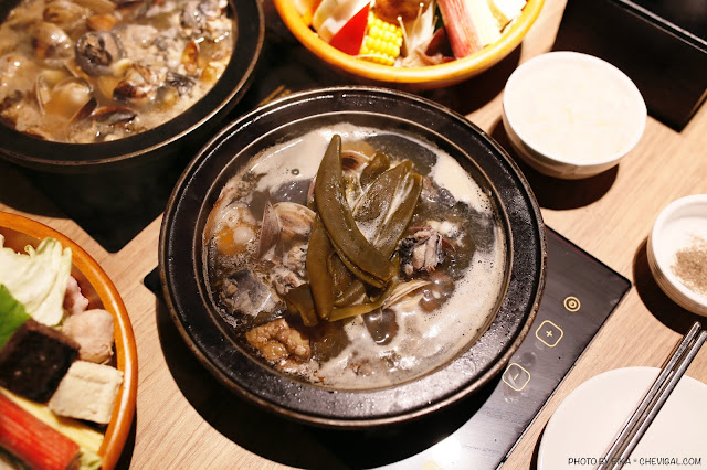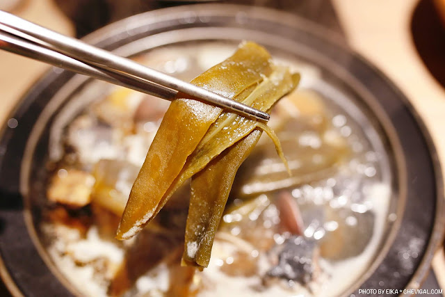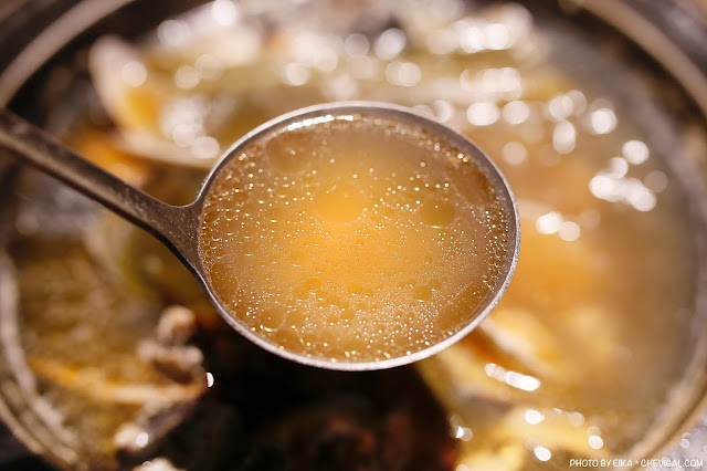湯頭色澤溫潤清澈,或許是因為有加入剝皮辣椒的緣故,風味會比前面的蒜頭鍋來得甜上幾分。
