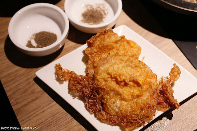 萬客什鍋還有這道「麻油炸蛋」真的必點!除了可以選擇蛋要全熟或是半熟,服務人員還會貼心地說明特別的吃法:浸泡在湯頭三至五秒,沾胡椒粉後即可食用。