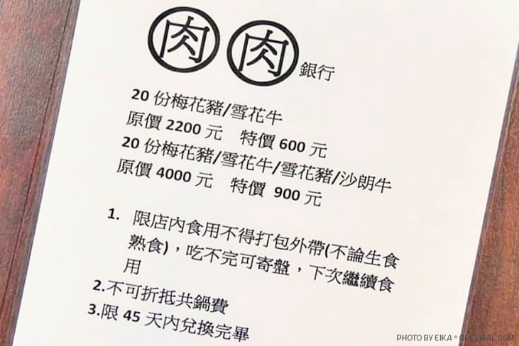 現在還有好康再加碼!只要來店裡開三鍋(單鍋300元以上)並加點肉肉銀行一套,就會贈送日本A5和牛一份,愛吃肉肉的你們,還不趕快揪團揪起來!
