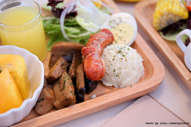 煙燻鮭魚佐巴薩米克醋貝果$285元,在午街貳拾的經典早午餐系列當中,煙燻鮭魚可以說是熱門的人氣品項。除了主餐以外,另有清爽沙拉、薯泥、菇類、香腸、水果與一小杯柳橙汁,看起來繽紛又豐富!