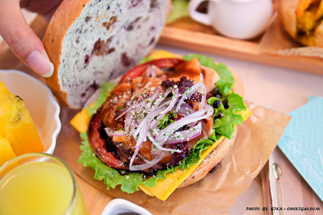 貝果非常Q彈紮實,紮實到連我們都覺得咀嚼的時間真的比較久,慢慢細嚼會發現五穀香氣益加明顯。貝果中間包夾著起司、番茄切片、生菜、紫洋蔥與煙燻鮭魚,豐富度堪比一般市售的漢堡。