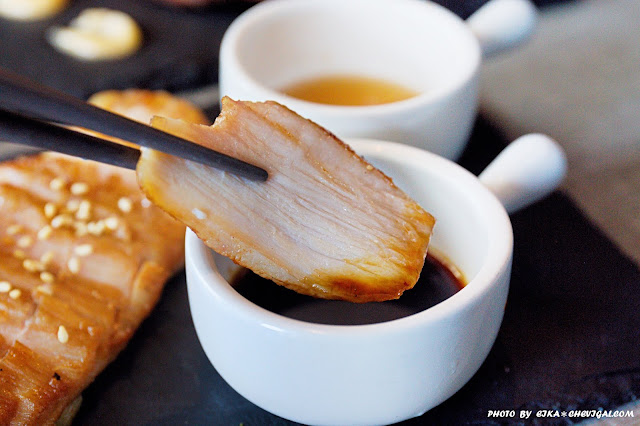 松阪豬排肉質富有Q彈帶勁,嫩中帶脆而不顯柴澀;不論是搭配蘋果醋的酸甜清爽,或是烤肉醬的鹹香入味,兩種截然不同的風味,都很耐吃~