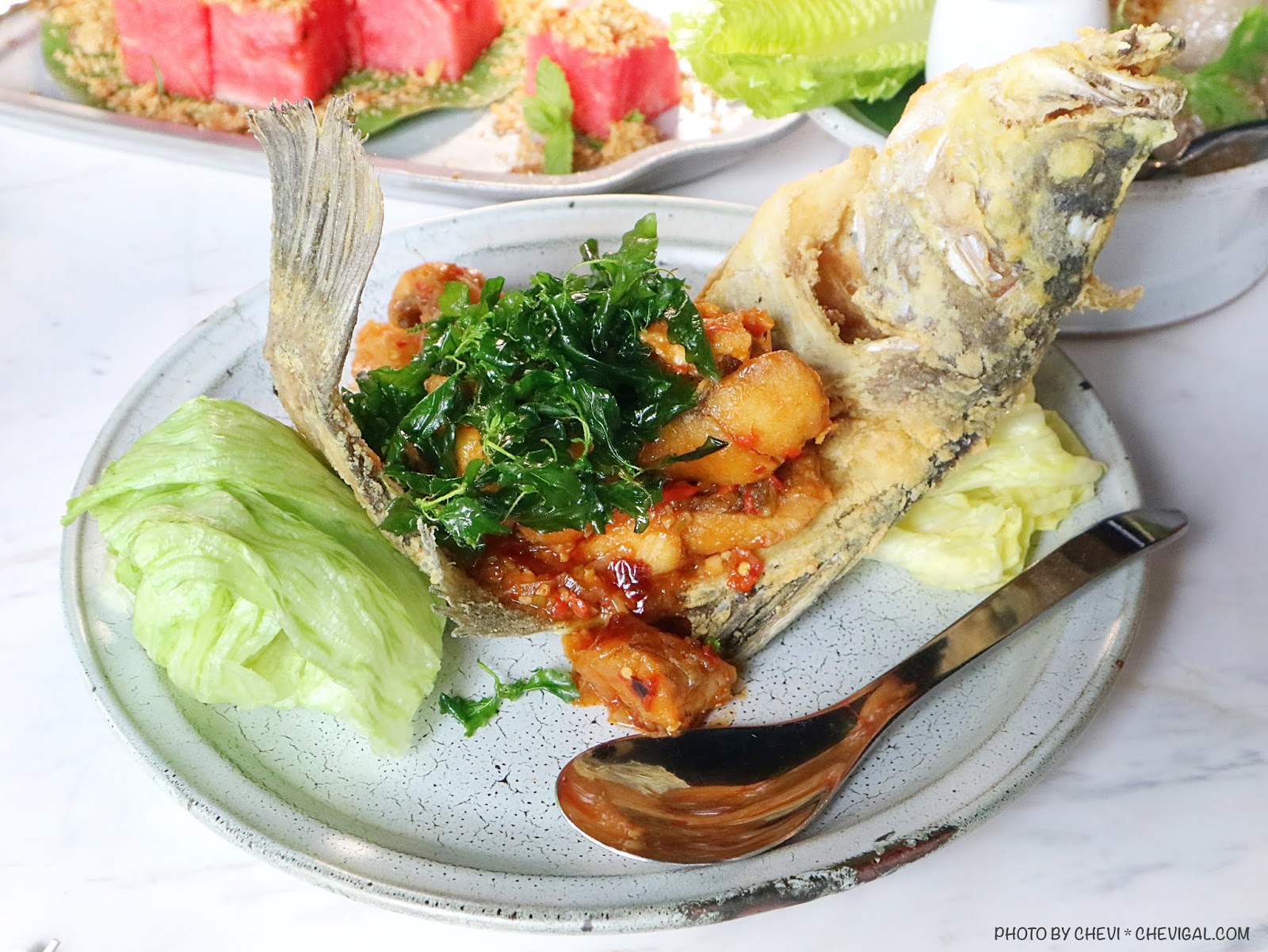 這道炸鱸魚三味醬一上桌,有種整條魚都快要跳起來的感覺,十分鮮活!以多種香料與辣醬翻炒片好的魚肉,油炸的酥香帶點辣度,類似偏辣的糖醋魚,還能吃到魚肉的鮮嫩口感。