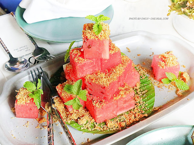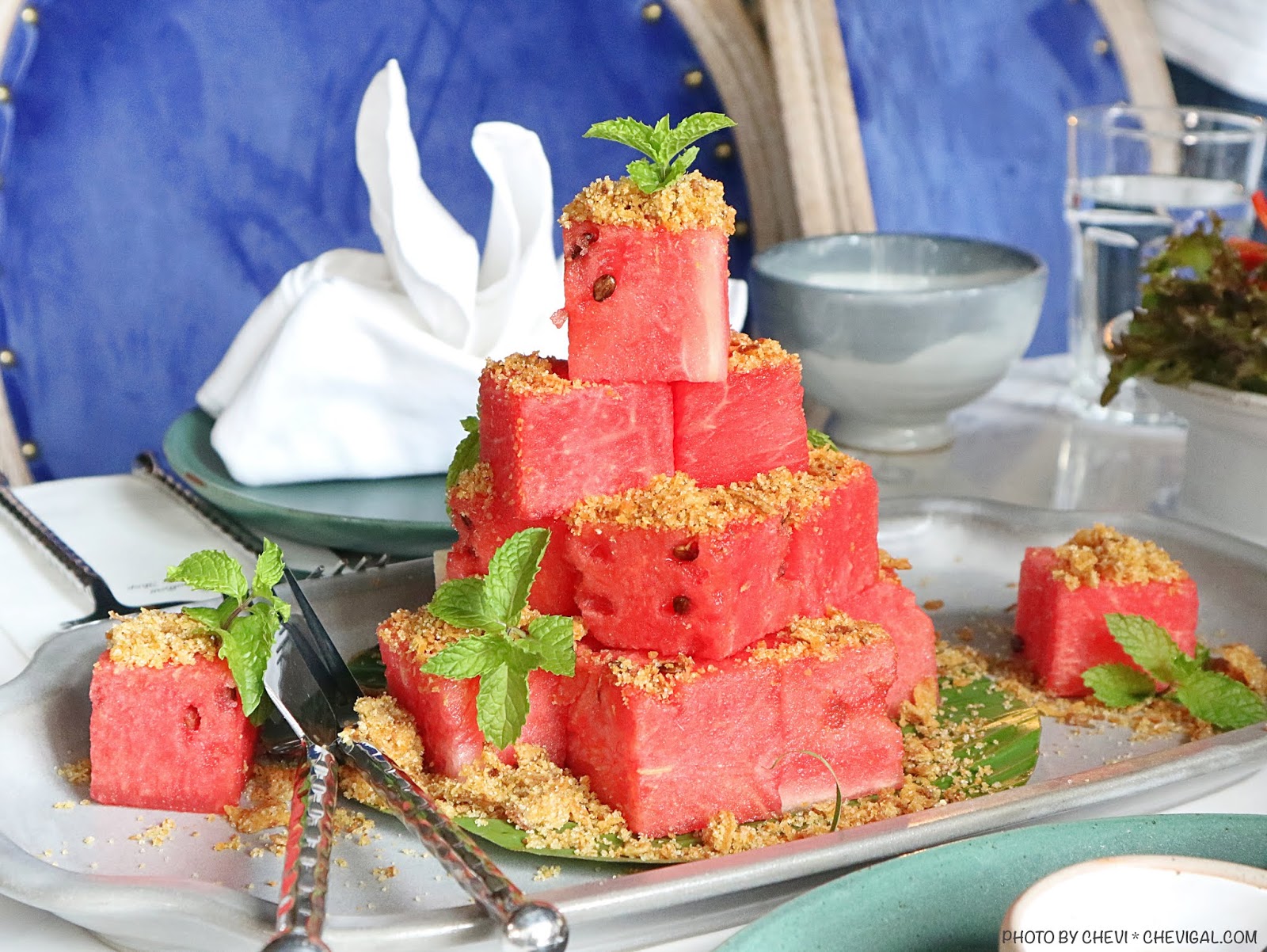 相信有不少朋友對於WOO Taiwan最深刻的餐點,就是這道疊成高塔的蜜汁魚酥佐西瓜!微鹹微甜的魚酥帶有飽滿鮮味,搭配上多汁清甜的紅肉西瓜,口味清爽有層次,非常適合夏天。