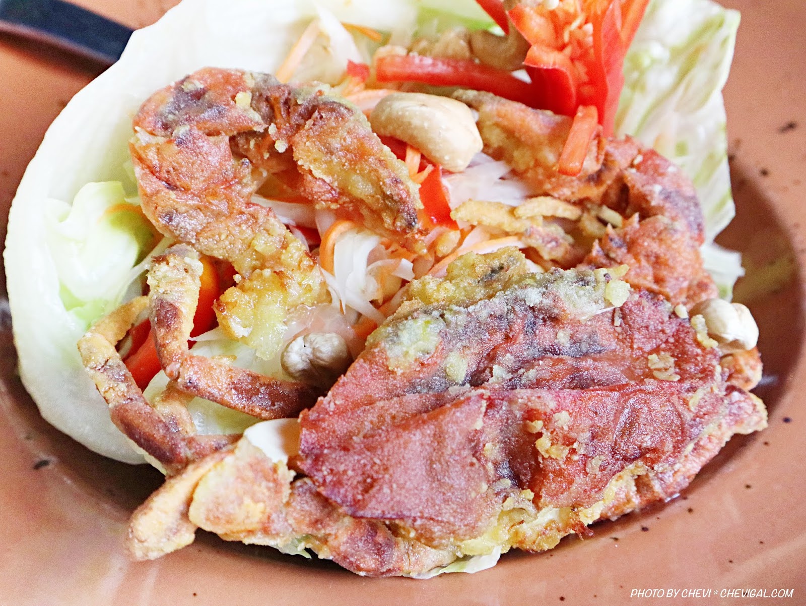最棒的是,炸得香酥的軟殼蟹根本就不需要再另外剝殼,外層的軟殼與彈牙的蟹肉吃來頗具層次,搭上酸甜脆口的青木瓜絲,帶點微微的辣度就很開胃!