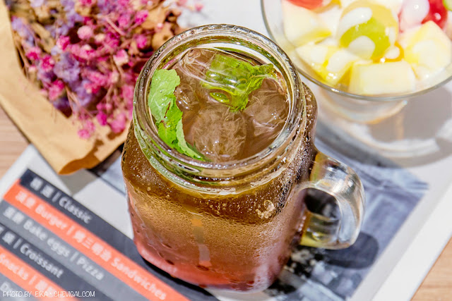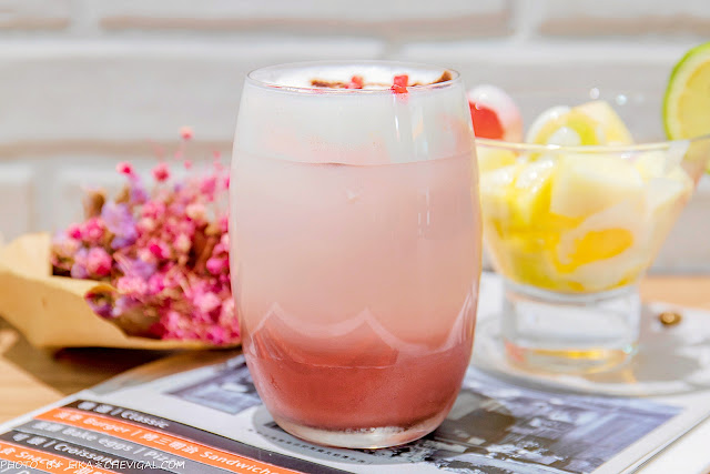 紫蘇梅瑪可蒂$110元,這款應該可以說是目前在早午餐店內喝過最奇妙的飲料了!裡面據說是加入了清酒糖漿、黑糖、薄荷、紫蘇梅與氣泡水,完全沒有酒精成份,酒的味道也沒那麼強烈,是很中式的味道,感覺特別適合沉穩氣質的男生XD