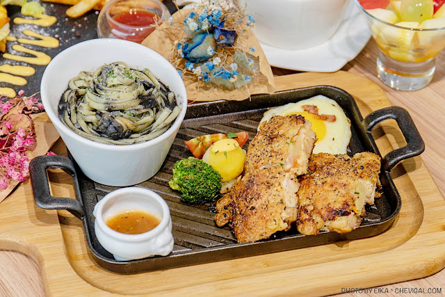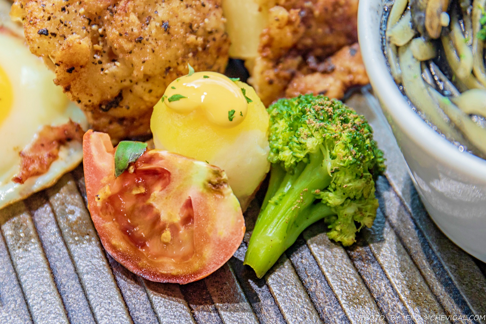 鐵板麵+培根煎蛋,我們這天的主餐搭配的是蔬果雞腿,整份餐點總共是200元;這樣的組合不僅相當豐盛,也讓我們有了初嚐日式料理與義式料理結合的奇妙體驗。