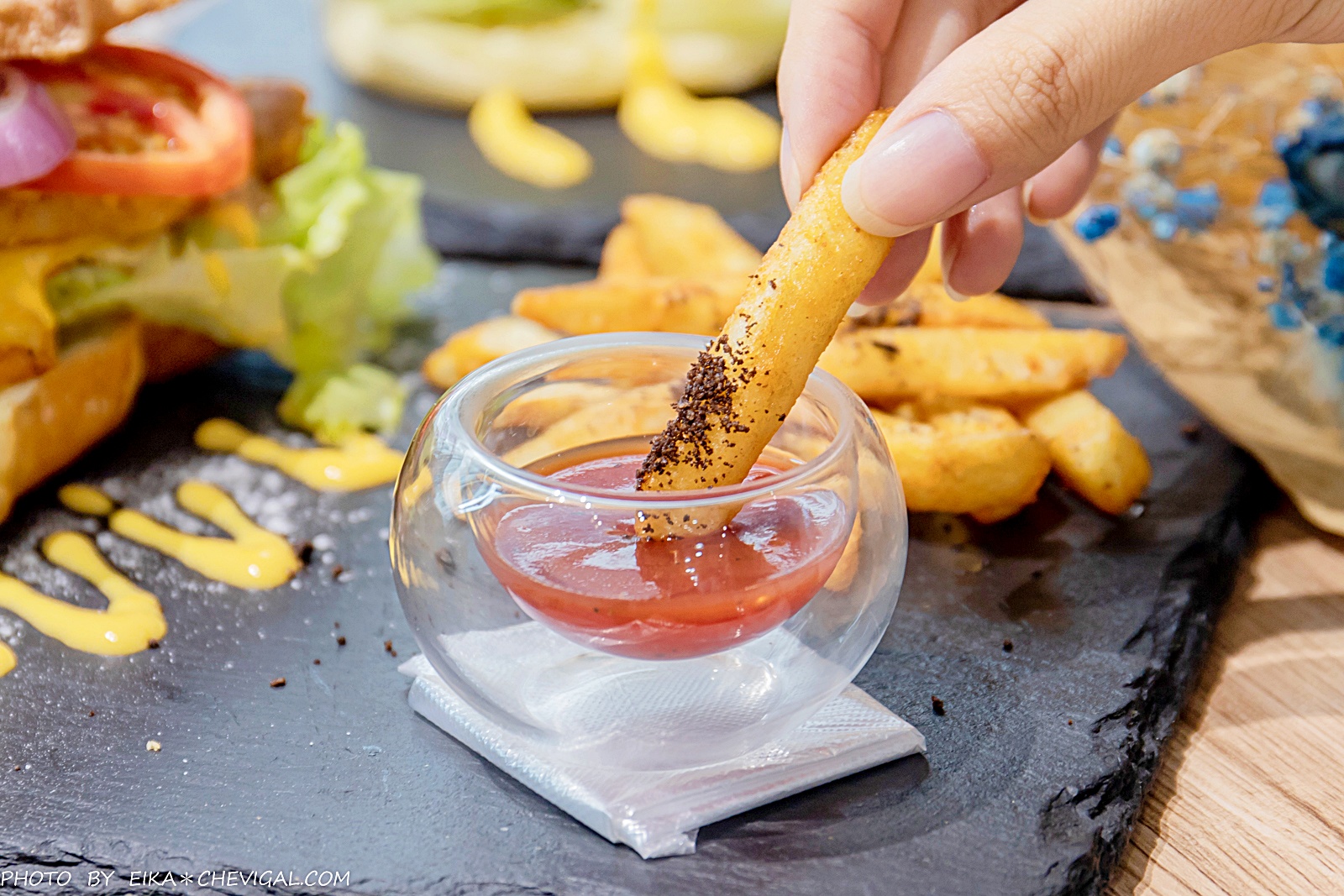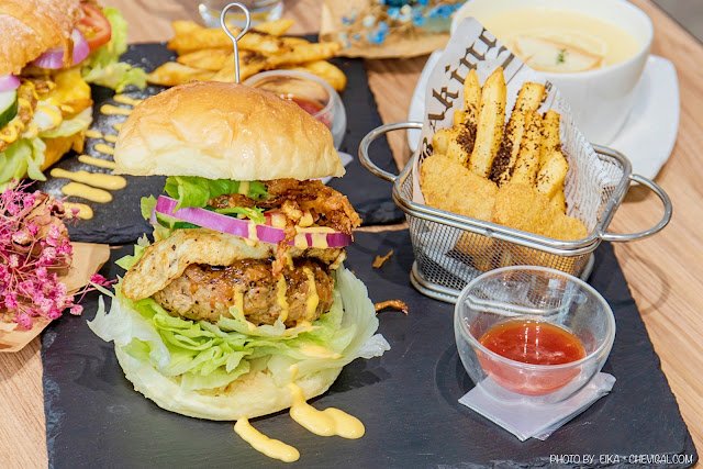 手作漢堡排$195元,是以手作牛肉漢堡搭配薯條與雞塊,餐點上桌時完全讓我們感受到了漢堡的大份量,幾乎是一般漢堡的兩倍大小,內容物豐富到不用叉子固定就會倒塌啦!