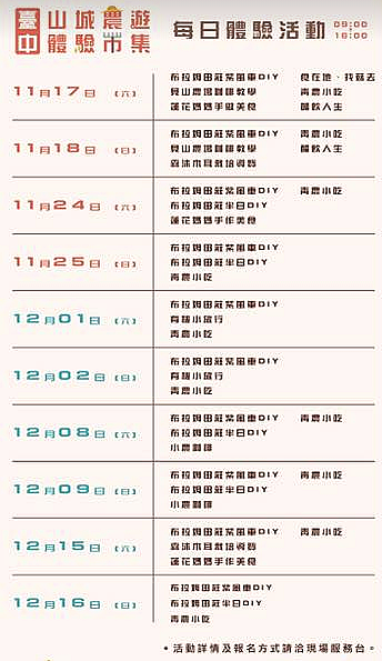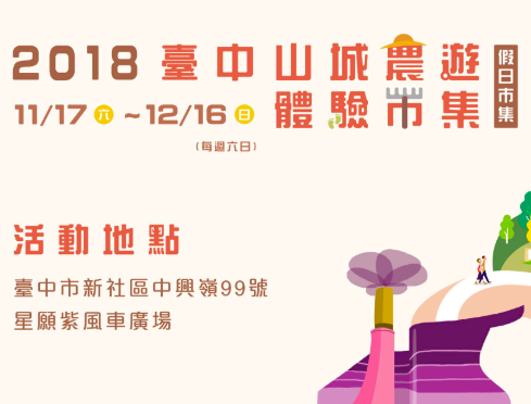 臺中山城農遊體驗假日市集則是位在星願紫風車廣場,自11/17至12/16期間的每週六及週日皆有舉辦相關的青農廚房、在地手信及DIY等活動,山城地區(新社、石岡、東勢、和平)之居民,憑身份證明文件,報名費還可再優惠50元。