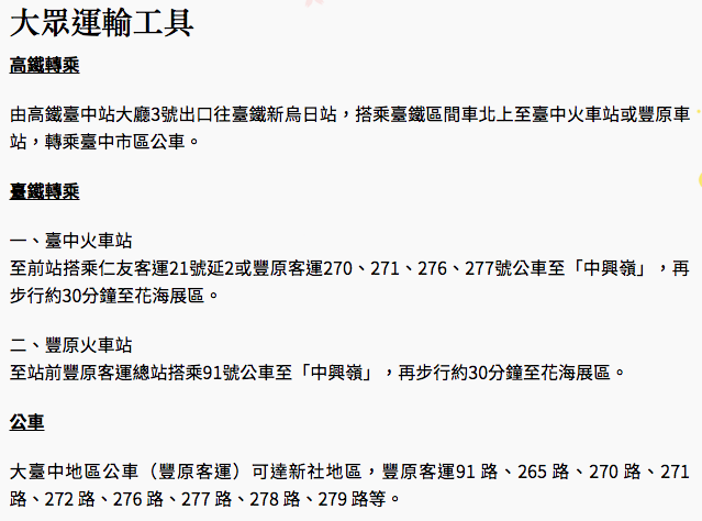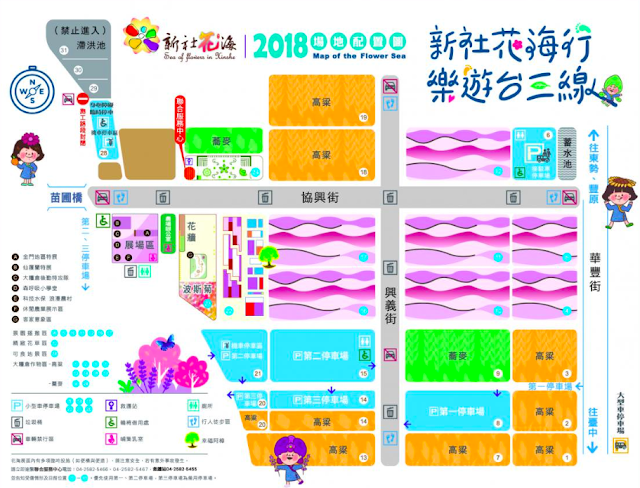 最後提供新社花海官網的交通資訊給你們參考,從國道、台三線與台中市區皆可抵達,另有規劃多區停車場可以停放愛車。