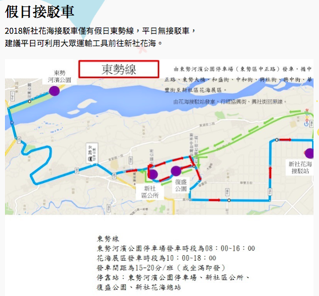 接駁車僅有提供假日東勢線,坐滿即會發車,平日建議可利用大眾運輸工具前往新社花海。
