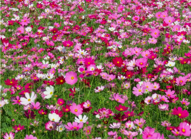 花卉區域有大家最經典的大波斯菊,還有白波斯菊、百日草、蕎麥、粉萼鼠尾草、羽狀雞冠花、孔雀草、千日紅等多種繽紛花種。