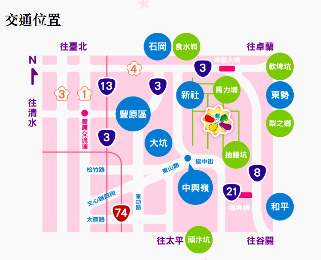 最後提供新社花海官網的交通資訊給你們參考,從國道、台三線與台中市區皆可抵達,另有規劃多區停車場可以停放愛車。