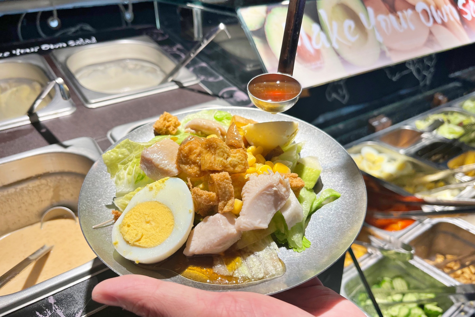更我們意外的是,竟然還有雞胸肉、雞蛋豆腐、乳酪丁這些在普通自助沙拉吧特別少見的品項,通通可以吃到飽,實在是太佛心了吧!