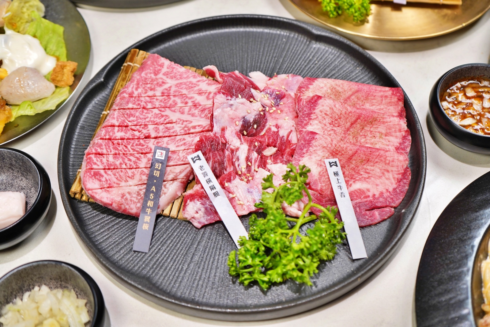 再來送上來的是A5幻切和牛翼板、美國橫隔膜、薄切牛舌,一次可以吃到不同部位的口感與風味。