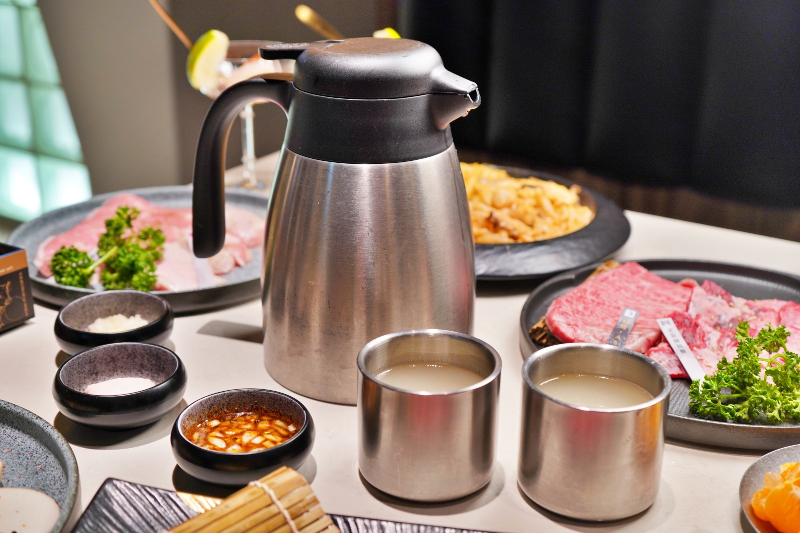 入座後有雞湯可以先暖暖胃,溫潤的風味喝起來很舒服;各式調味料、醬汁與烤肉必備的豬油塊也是一應俱全。