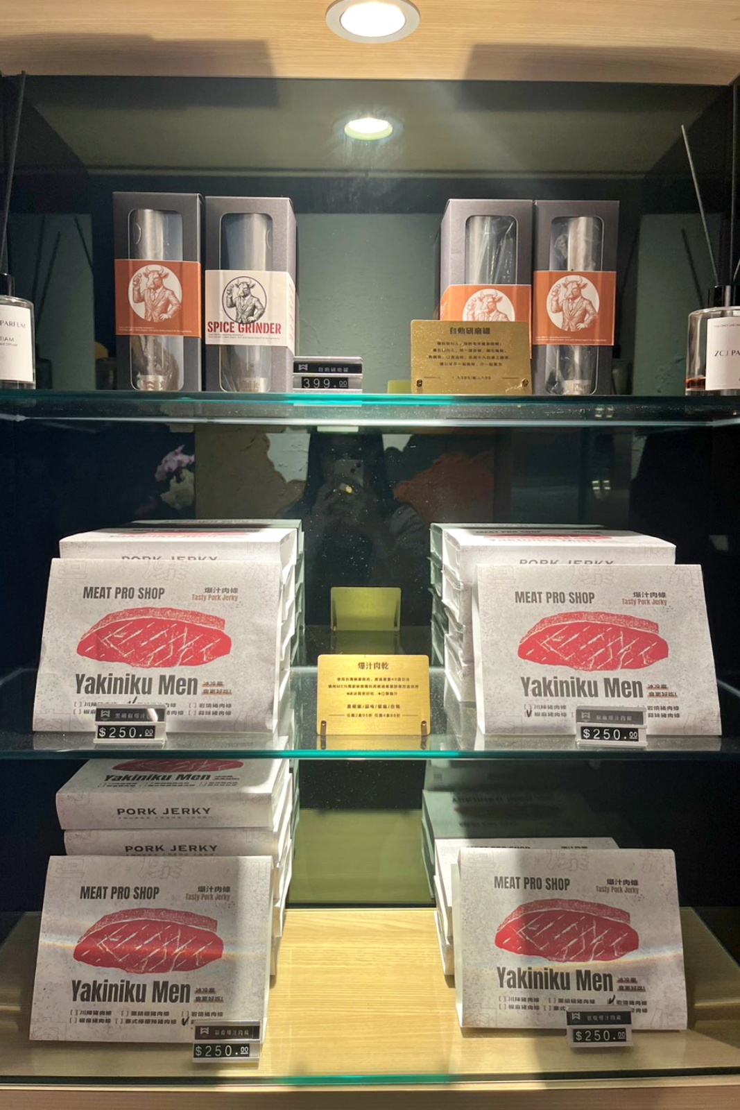 對了,如果你們吃完覺得有喜歡,也有肉乾禮盒與自動研磨罐等周邊商品可以選擇,他們家的爆汁肉條主打厚切醃漬、以直火炙烤至微焦,咬下的瞬間,肉汁從紋理中迸發而出, 筋膜間保留恰到好處的嚼勁,搭配獨家醬香,是熟客最愛的下酒良伴,拿來送禮也很不賴哦!(未滿18歲請勿飲酒)