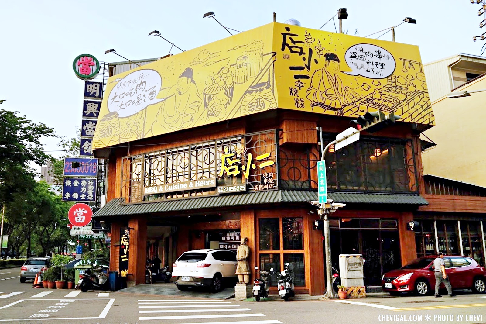 店小二位在忠明南路上,斗大的黃色招牌看板,搭配上木質質地的建築主體,很容易一眼就找到這裡。店前騎樓的空格可提供顧客停車,附近路旁也有汽機車的停車格。