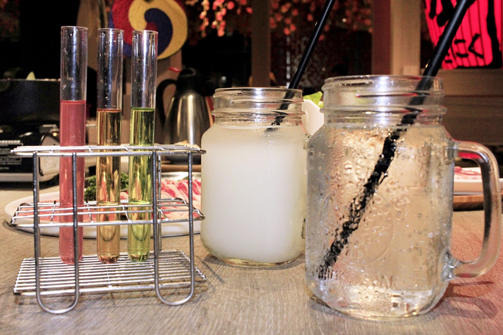 咦?我們不是好好的在吃燒肉嗎?桌上出現試管和試管架是怎麼回事?放心不是要進實驗室,原來是現在連飲料都可以讓客人依個人喜好的比例下去調製啦!這天拿到的試管口味有櫻花、白桃與青蘋果,美麗的顏色真是讓人目不轉睛啊!