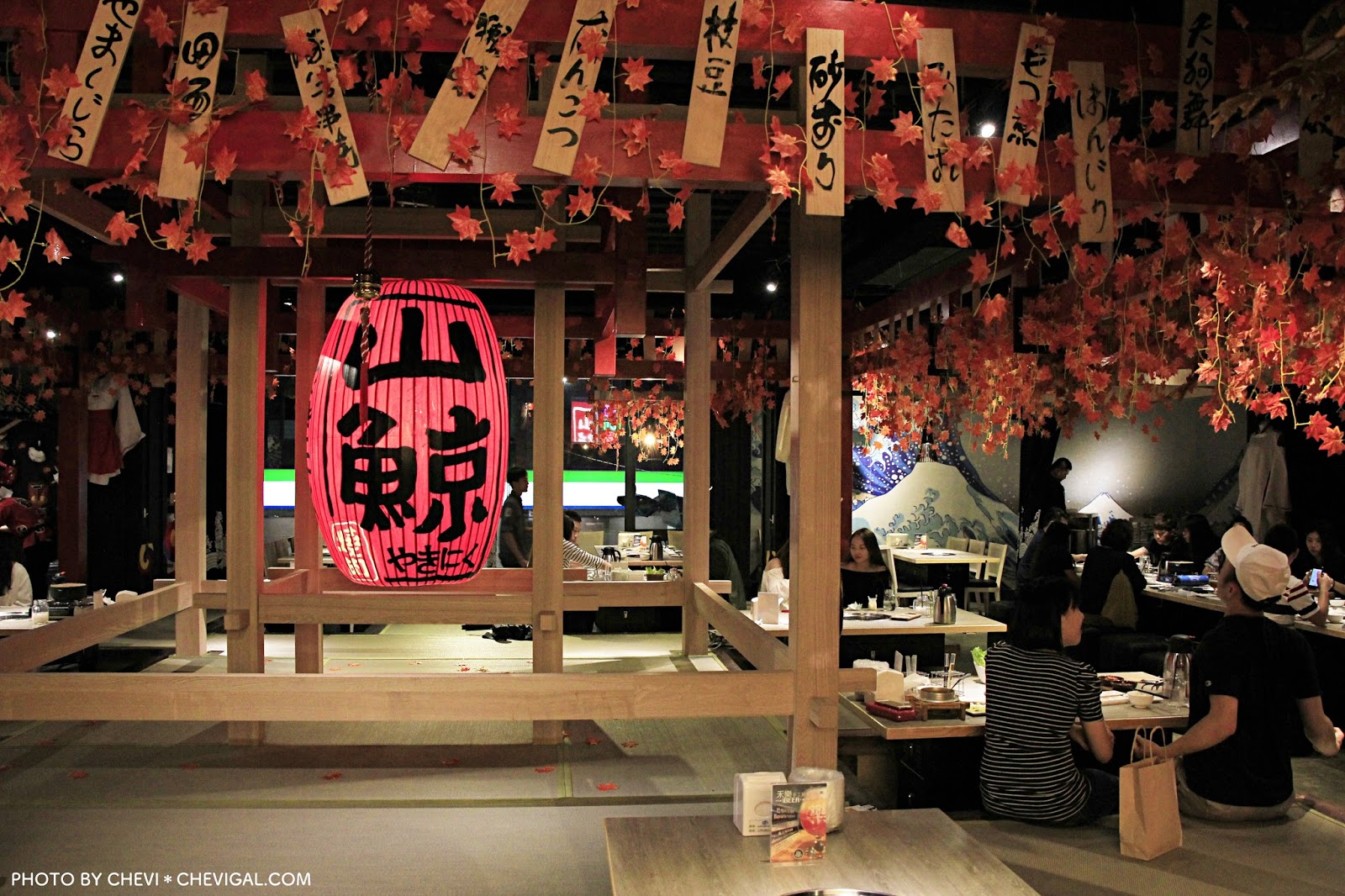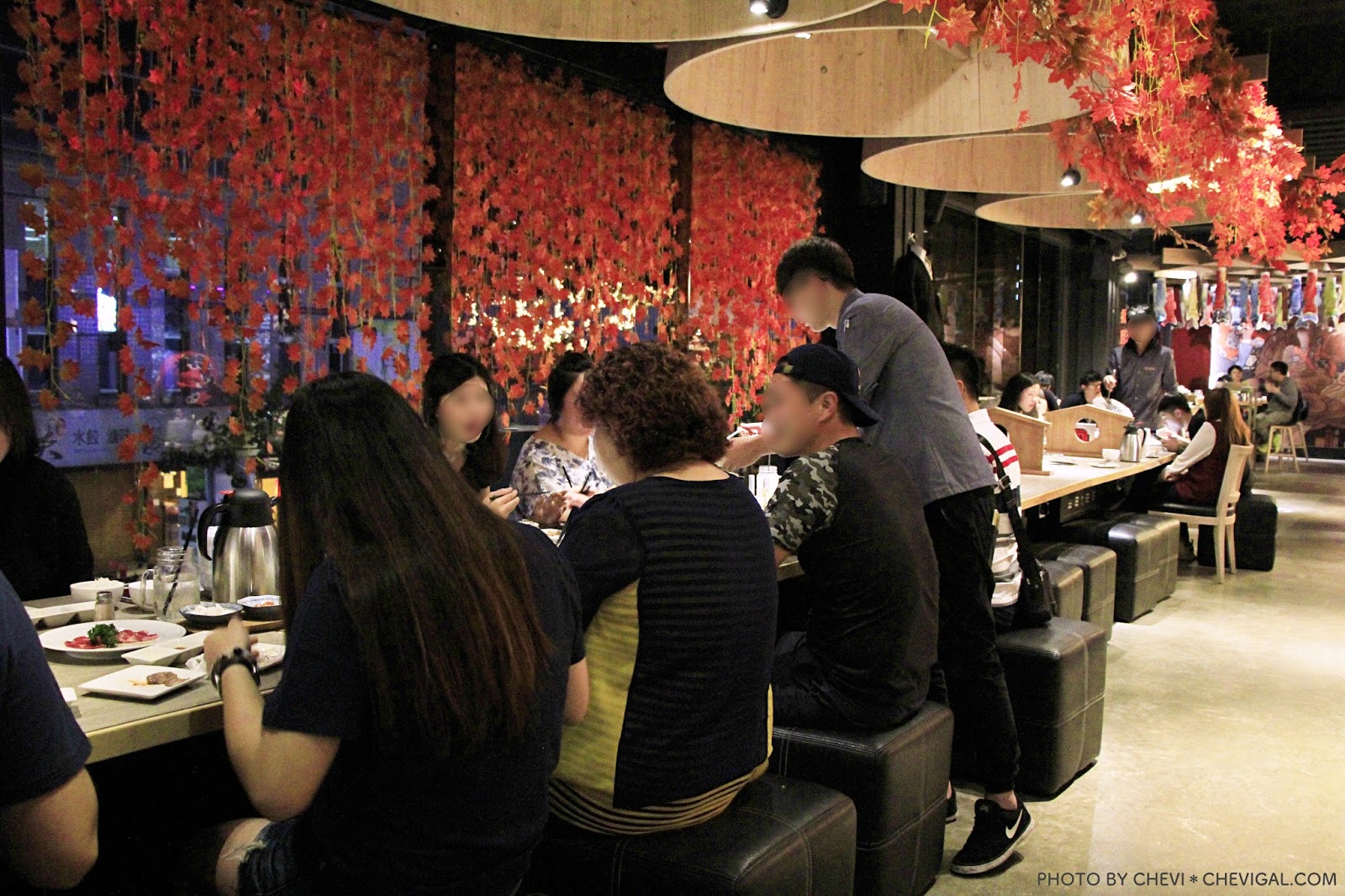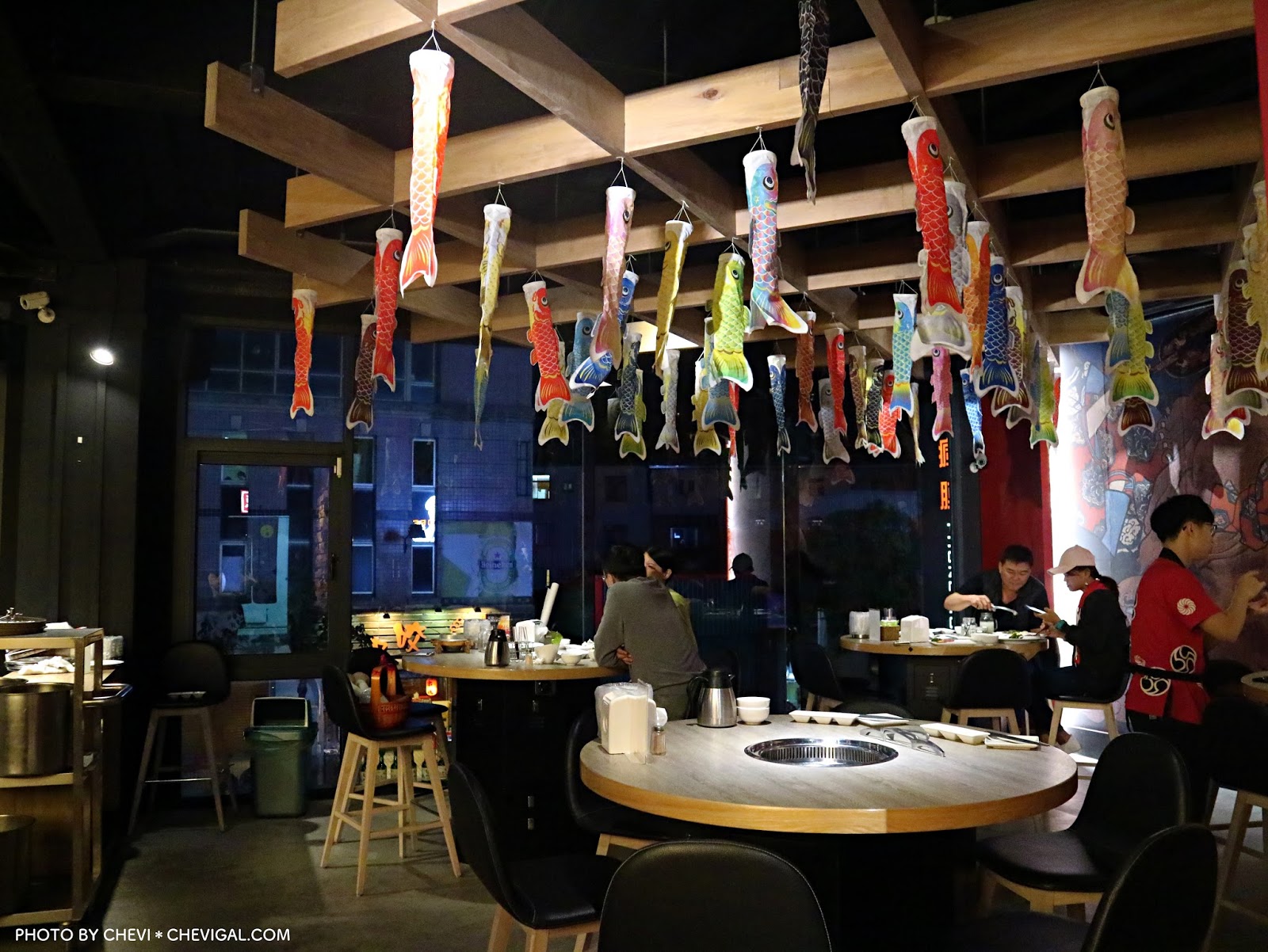 除了榻榻米與一般的座位區,還有一區是以高腳椅為主的區域,雖然沒有楓紅如此豔麗,但頭上也搖曳著多串色彩鮮豔的鯉魚旗,別有一番日式風情。