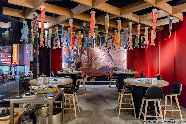 除了榻榻米與一般的座位區,還有一區是以高腳椅為主的區域,雖然沒有櫻花如此嬌豔,但頭上也搖曳著多串色彩鮮豔的鯉魚旗,別有一番日式風情。