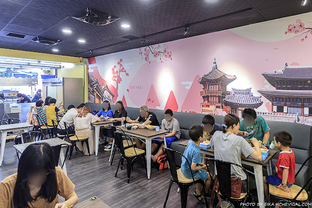 用餐區域以一樓為主,牆面上有各式韓國知名景點的圖樣,大部份為兩人座與四人座,另外還有靠牆的沙發座位,不論是親子聚餐、朋友聚會都很適合;如果你們用餐人數較多,建議可以事先訂位,服務人員也能協助安排併桌。