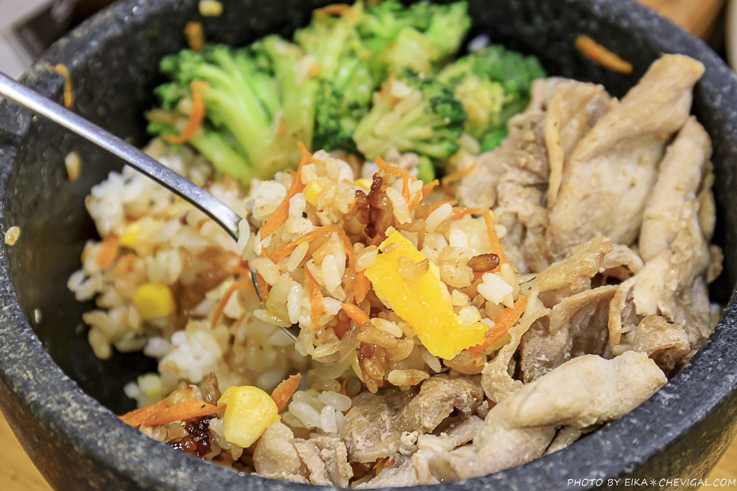 如果實在不知道該如何選擇餐點,這裡也有雙人套餐與三人套餐的組合可以搭配;像我們這天就點了雙人套餐,石鍋豬肉拌飯裡面有豬肉、玉米、高麗菜、胡蘿蔔與洋蔥,搭配韓國的特製醬汁,整體並沒有辣度,小朋友也很適合享用,愛吃辣的朋友可以再單點泡菜一起拌入。