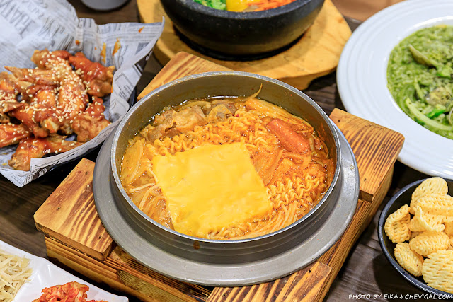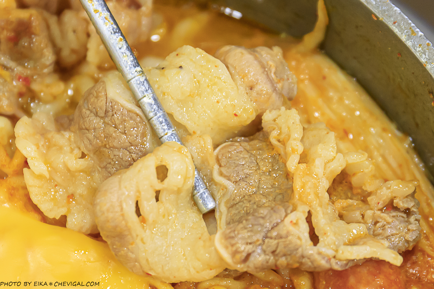 牛肉部隊鍋的份量也很有誠意,選用了泡菜湯底,搭配韓國泡麵與多種配料,表面還覆上一整片起司片,不能吃牛肉的朋友,也可以選擇豬肉或海鮮口味哦~