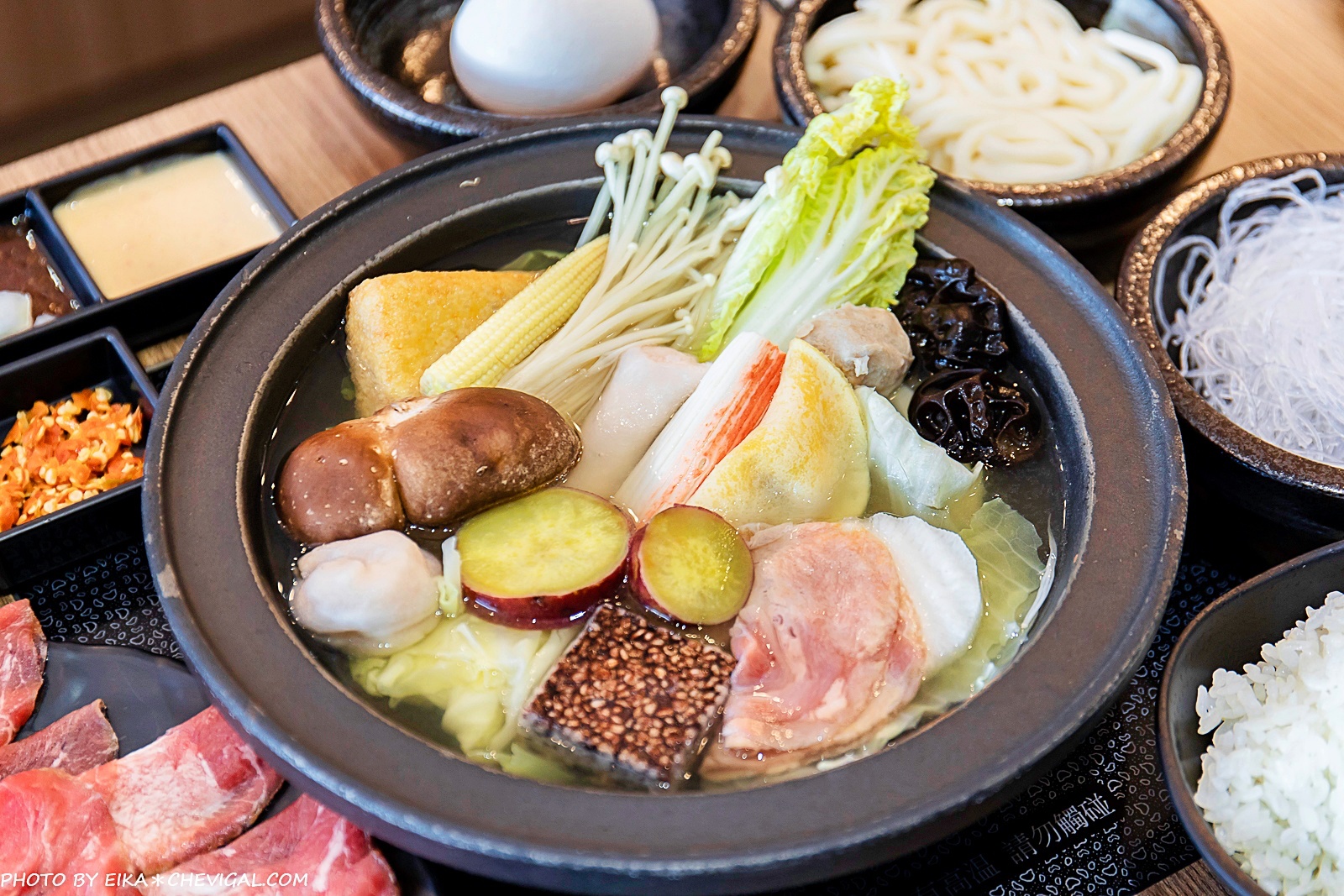 像是娃娃菜、香菇、木耳、米血糕、蛋餃、三角油豆腐、蟹肉棒與高麗菜等等,甚至還有我們超愛的栗子地瓜,不需要煮得太熟,帶皮且紮實綿密的口感,特別鮮甜!