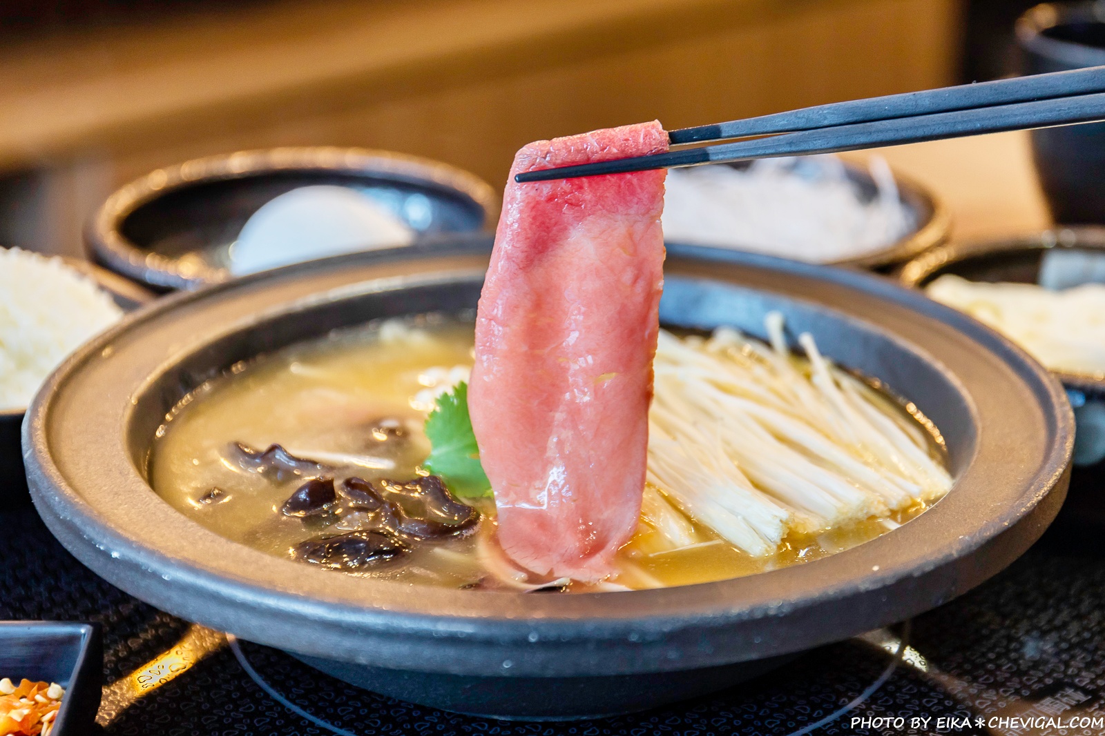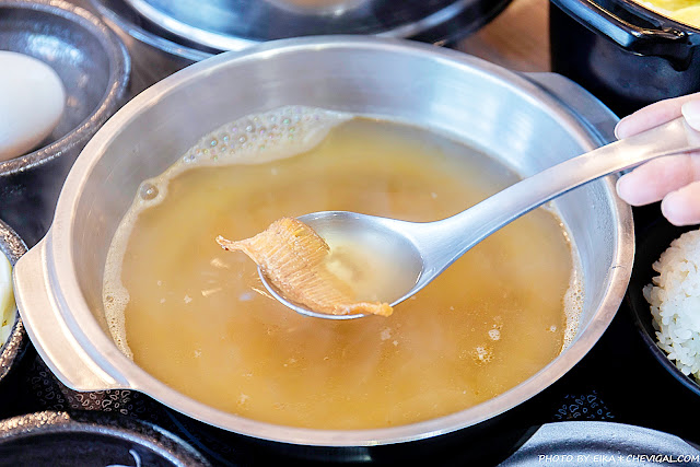 光是用湯勺撈起金黃湯頭,就能發現相當濃稠,喝起來特別香醇順口~隨著我們用餐期間不斷加熱、烹煮,湯頭的稠度與鹹度也會隨之提高,記得可以再向服務人員索取高湯調整濃度哦!