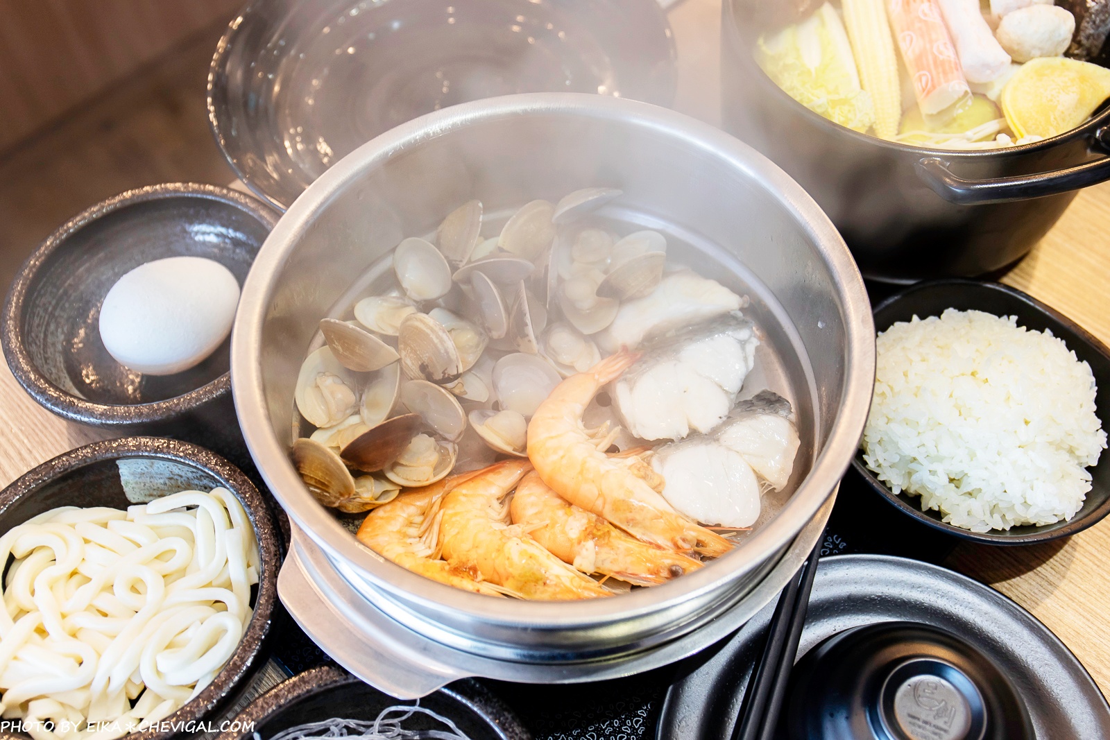 烹煮的方式很簡單,只要把蒸籠放在湯鍋上方蒸煮3分鐘,不僅可以剛好蒸熟海鮮,多種海鮮的鮮甜風味也會順勢流入湯鍋之中,湯頭喝起來更加鮮美,而且服務人員還會幫忙計時哦~