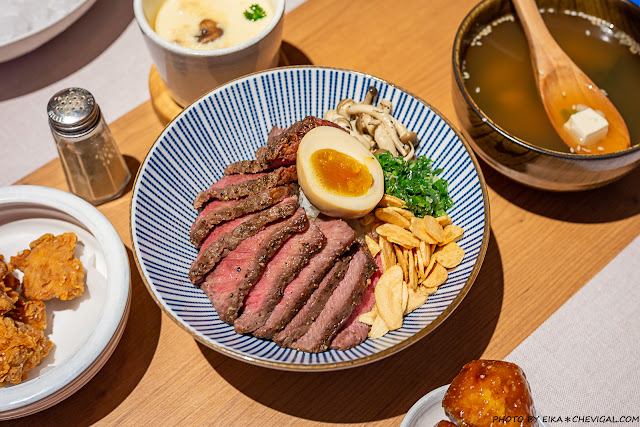 牛排丼飯$388元,雖然是丼飯系列當中最高價的其中一款,不過看到滿滿十大片厚實的牛排覆蓋在丼飯表面上,幾乎根本看不到白飯,香嫩彈牙的口感搭配旁邊香酥的蒜片,真的愈吃愈涮嘴!一般的女孩兒要獨自完食應該會有困難哈~