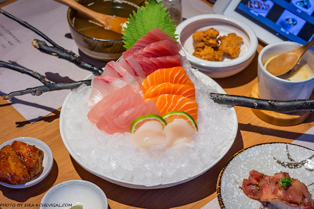 五品刺身$358元,底下還有兩顆干貝,整體吃起來的新鮮度很夠,魚肉更是沒有什麼筋,兩個人享用份量很足夠,讓愛吃生魚片的我們覺得還蠻滿意的。不過底下裝飾用的樹枝真的有點太佔位子,其實不幫我們裝飾也沒關係啦 XDD