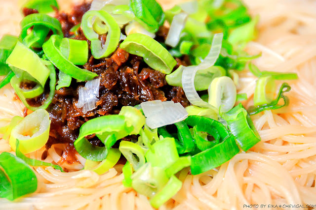 麵線表面大方地放上翠綠蔥花與鮮美的XO醬,其中XO醬還是自家炒製的口味,鹹香夠味又帶點微微的辣度,重點是也不會過於膩口,非常開胃。